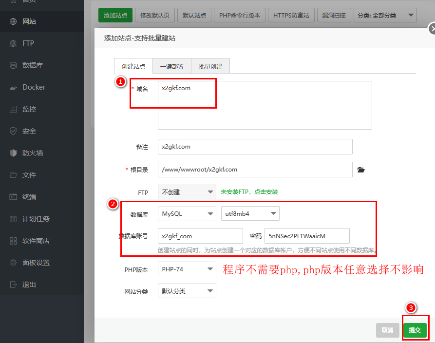 1. 如下图1、2、3创建网站和数据库,数据库选择后可以直接按默认